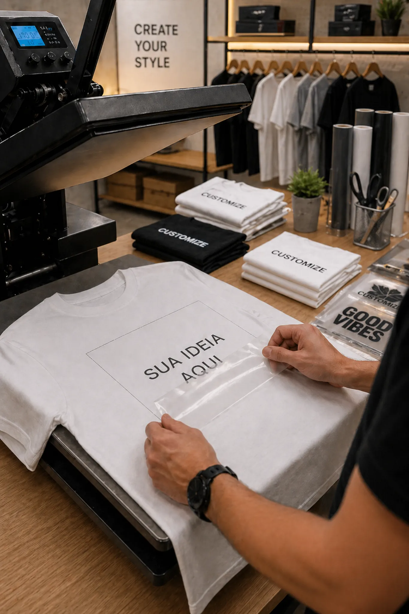 Ajustamos a ideia, preparamos a aplicação visual e montamos o mockup para você aprovar antes da produção.